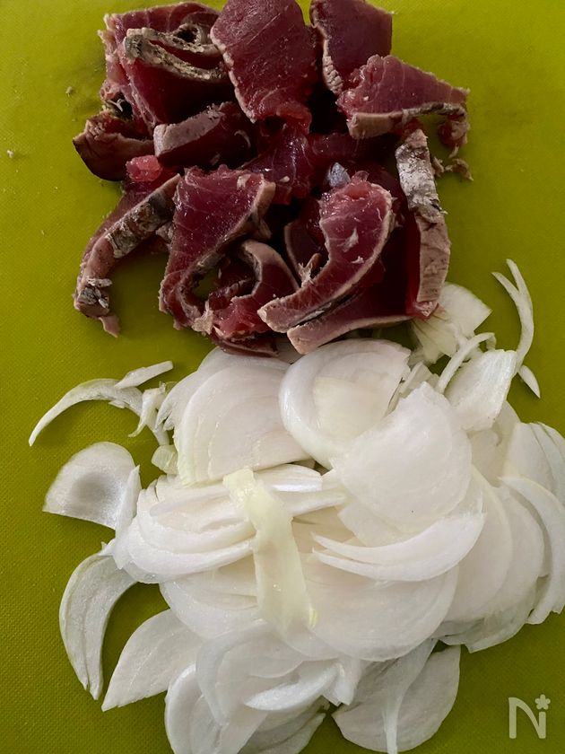 (下準備) かつおのたたきは5〜6mm幅のそぎ切りする。