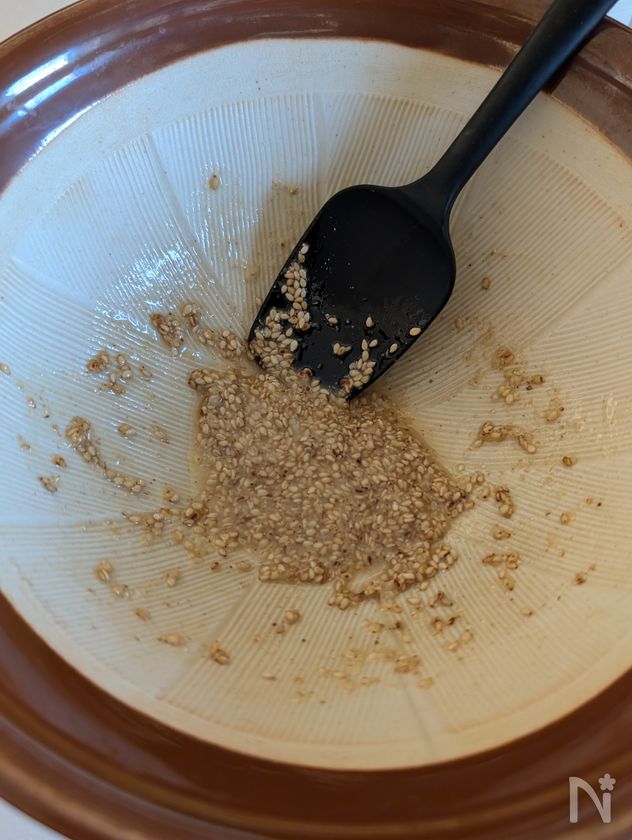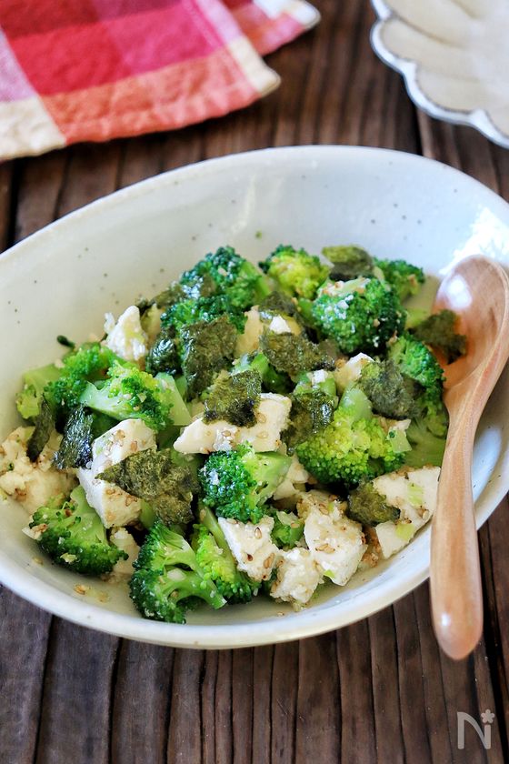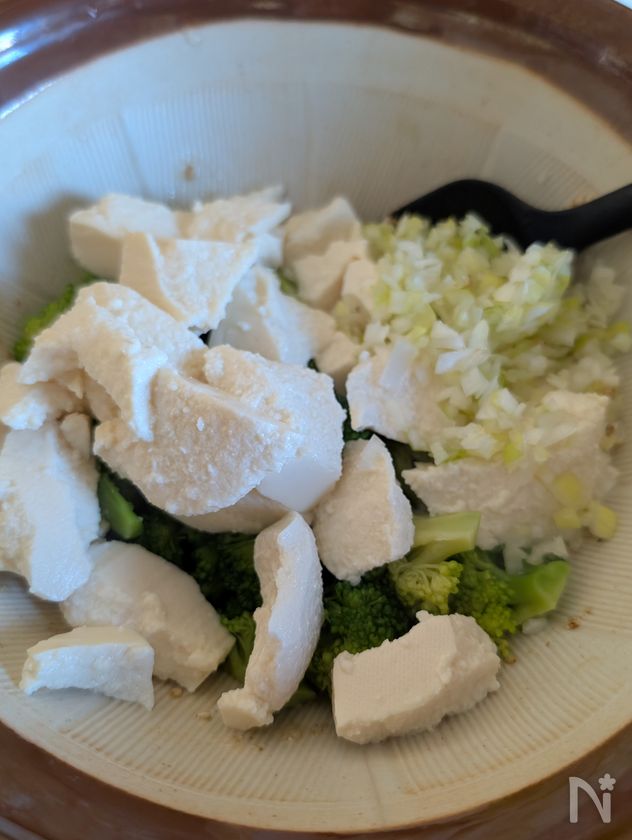 (4) 3と豆腐、ブロッコリー、白ねぎを混ぜ合わせる。豆腐がつぶれないように、さっくりと。