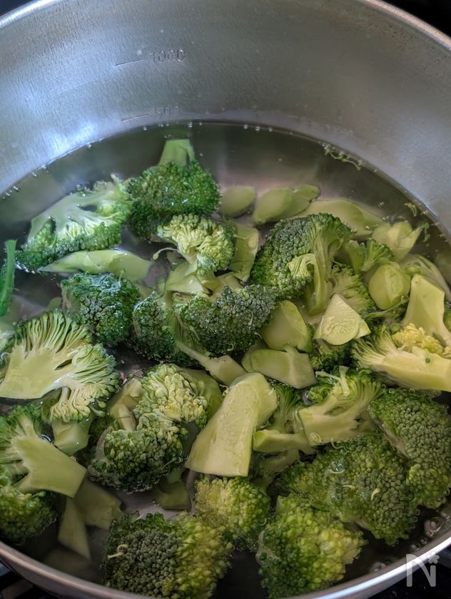 【工程2】ブロッコリーは、ざるに取った後も予熱で火が通りますので、あまり長い時間茹でなくてもOKです。