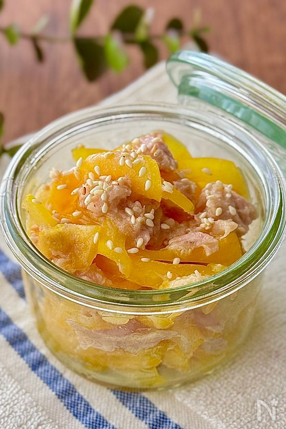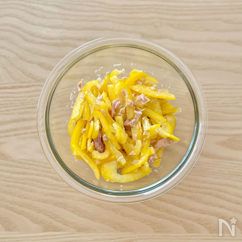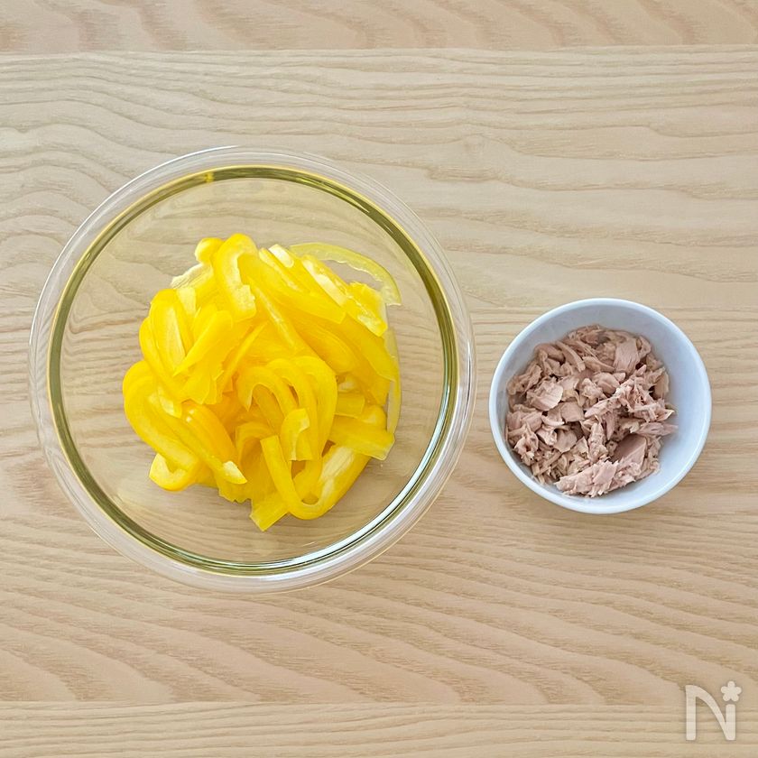 (1) パプリカは長さを半分に切り、薄切りにする。ツナ(水煮缶)は水気を切る。