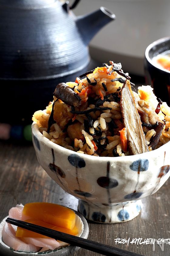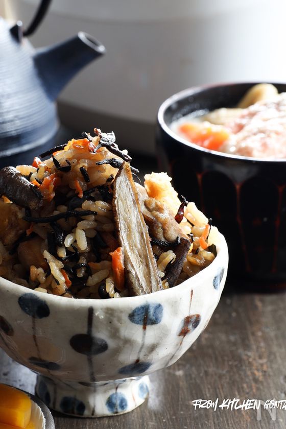 (6) 炊飯器の釜に、(4)で残った煮込んだ具材と、油揚げ、人参、ひじきを上にのせる。