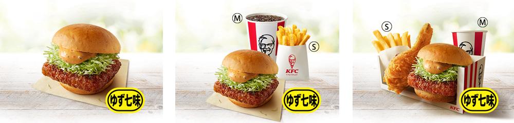 左から「和風チキンカツバーガー本格ゆず七味」「和風チキンカツバーガー本格ゆず七味セット」「和風チキンカツバーガー本格ゆず七味よくばりセット」イメージ