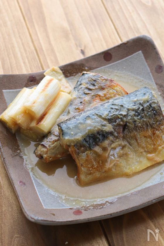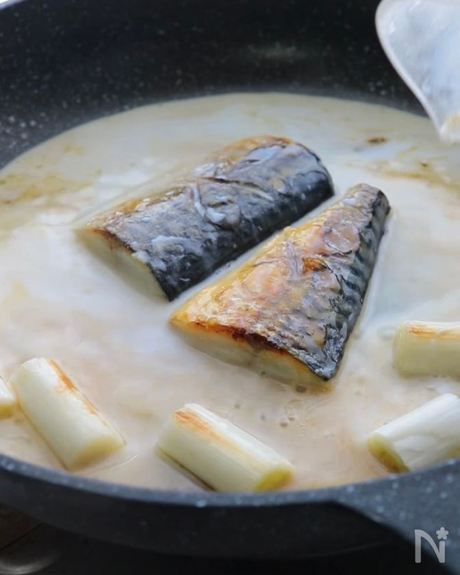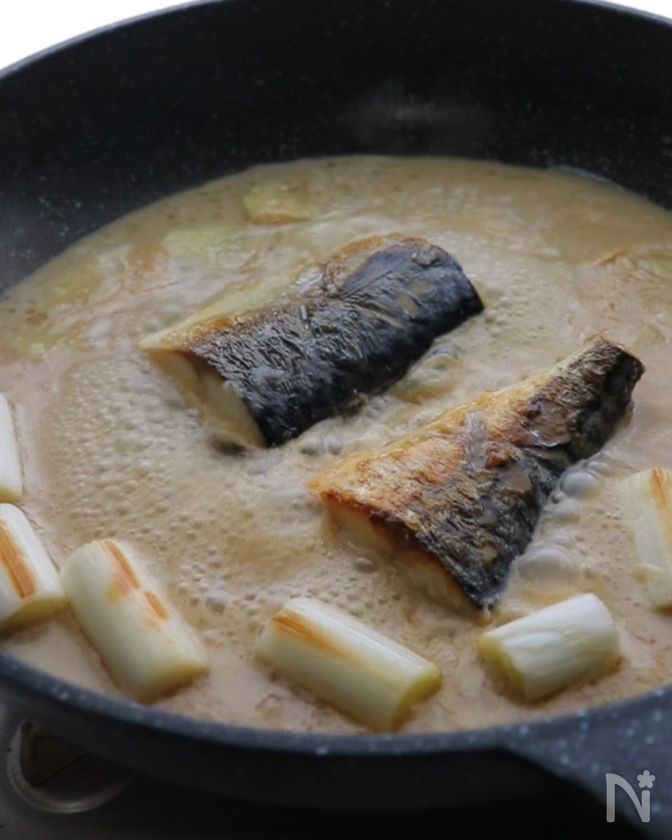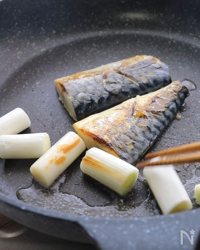 (1) フライパンに油(分量外)を敷き、中火にかけて、さばと長ねぎ(白い部分)を加えて表面がこんがりとするまで焼く。