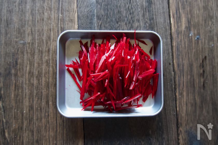 (2) ビーツは厚めに皮をむき、細切りにする。