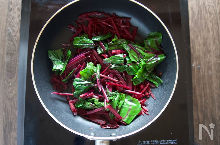 (3) フライパンに油を入れて熱し、ビーツを入れて中火で炒める。酒を振り、水気が飛び、しんなりとするまで炒めたら、1のビーツの茎、葉の順に入れて塩、胡椒を振る。