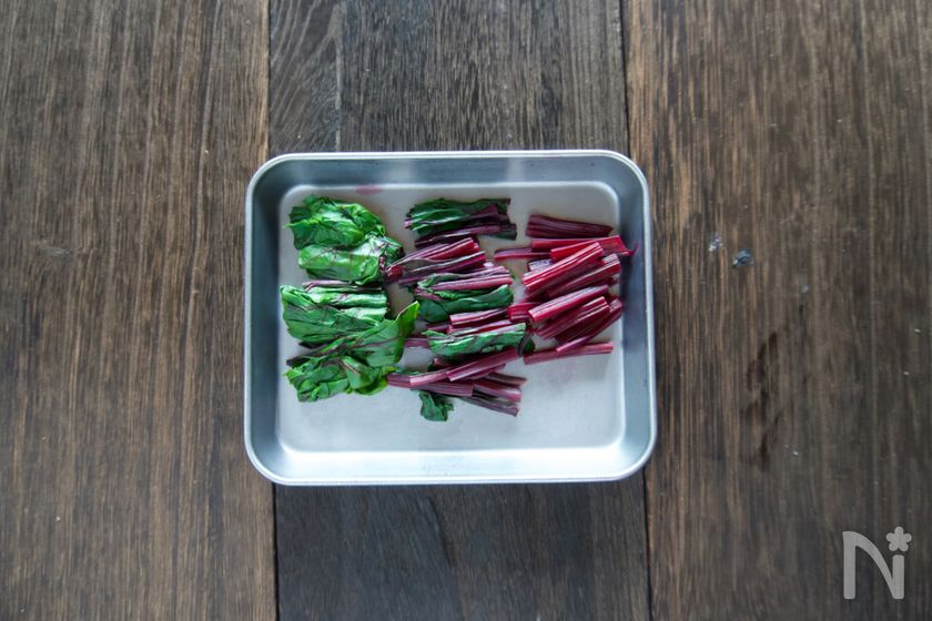 (1) (あれば)ビーツの葉は、鍋に水を入れて火にかけ、塩少々(分量外)を入れる。沸騰したら葉を硬い方から入れ、しんなりとするまで茹でる。冷水に取り、3cm長さに切る。