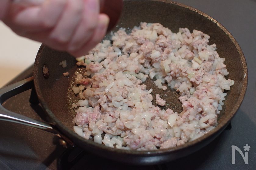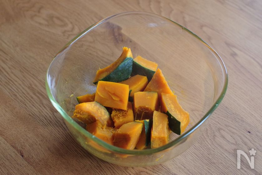 かぼちゃを電子レンジで加熱している間に、玉ねぎをみじん切りにして豚ひき肉と炒めておくとスムーズです。