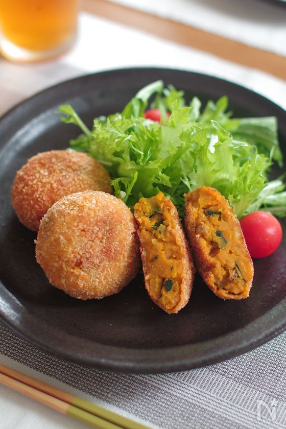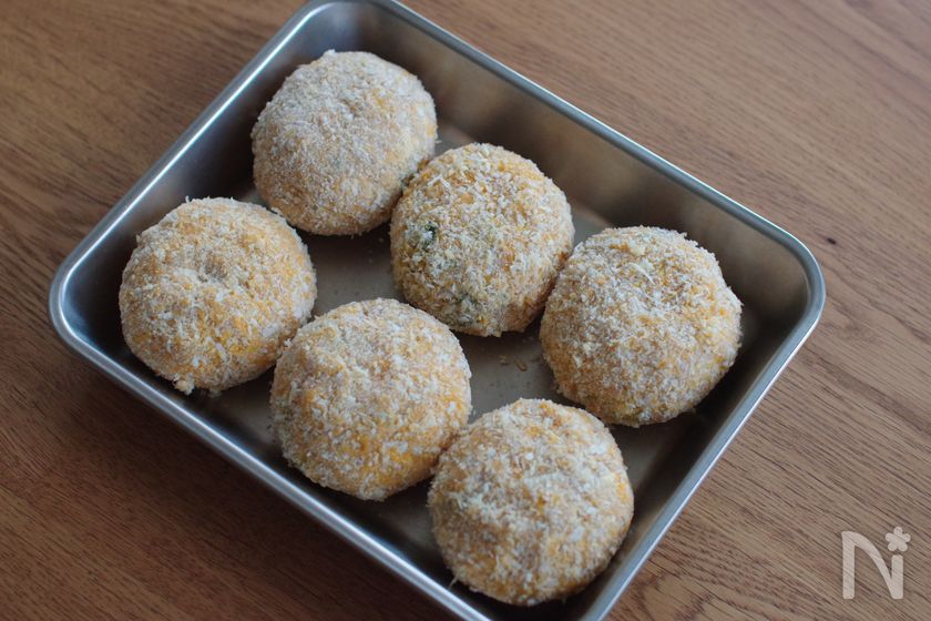 タネが熱いまま衣をつけて揚げるとコロッケが爆発しやすいので、しっかり冷ましてから薄力粉、溶き卵、パン粉をつけてください。