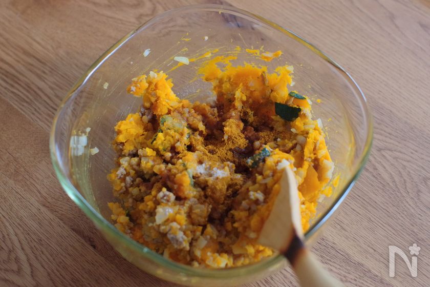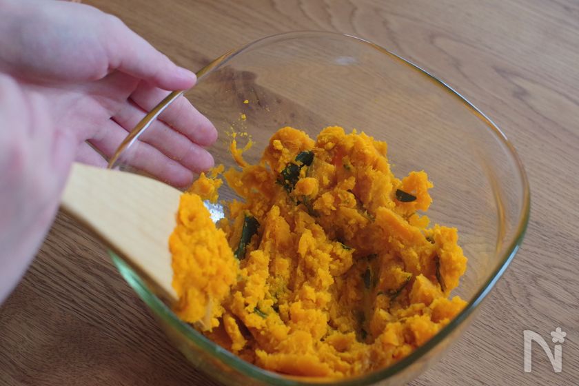 (2) かぼちゃは熱いうちに木べらやフォークで粗めに潰す。