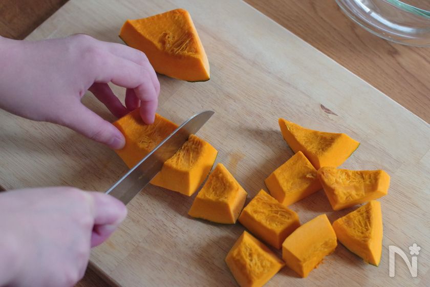 (下準備) かぼちゃは種とワタを取り除き、一口サイズに切る。