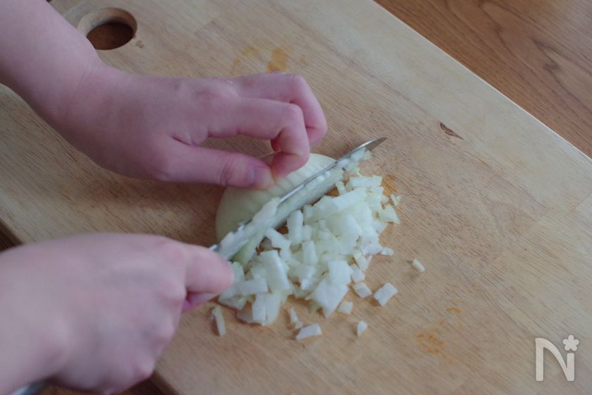 (3) 玉ねぎをみじん切りにする。