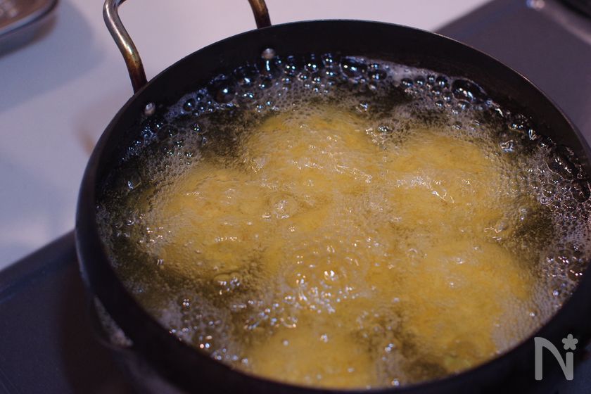 (7) 170℃に熱した揚げ油で、返しながらきつね色になるまで揚げる。