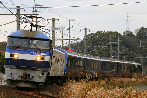 機関車に牽引される「ロイヤル」。試運転初日を担当した機関車はEF210形109号機。東急からの要望で「トーキュウ」が実現したという。予讃線波方~大西(坪内政美撮影)。