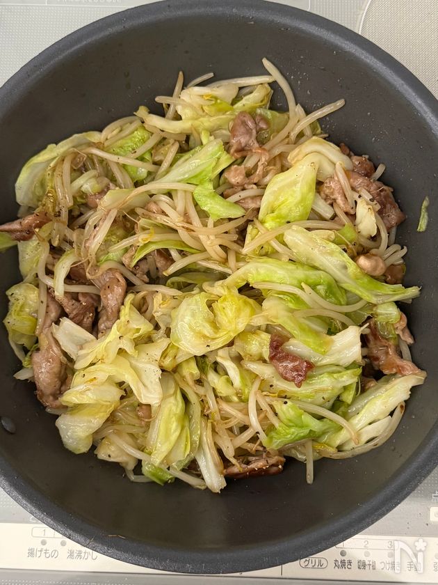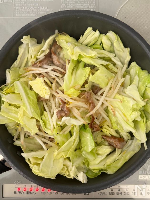 (2) しっかり肉に焼き色がついたら、強火にし、もやしとキャベツを入れる。