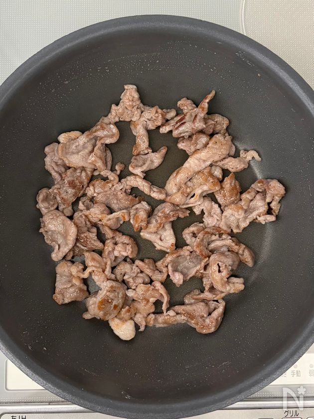 (1) フライパンに、ごま油を引き、豚こま切れ肉を中火で炒める。