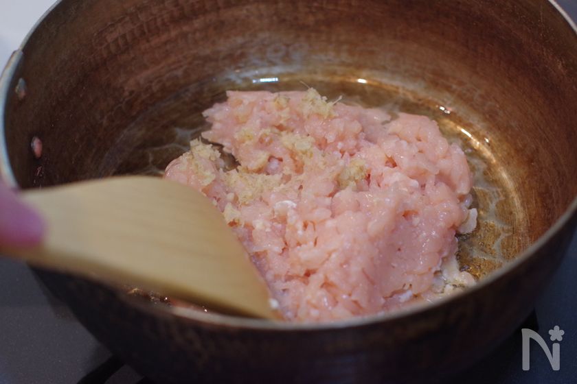 (1) 鍋にごま油をひき、中火で熱し鶏ひき肉、すりおろし生姜を炒める。