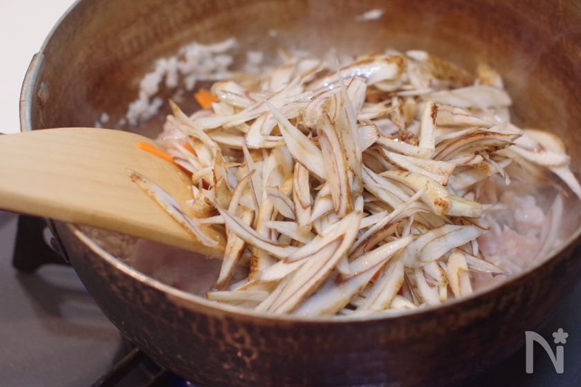 (下準備) ごぼうはささがき、もしくは斜め薄切りにして水にさらす。にんじんは皮を剥き短冊切りにする。