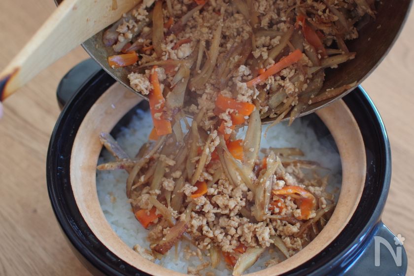 (2) 鶏ひき肉に半分くらい火が通ったらごぼう、にんじんを加え3分炒める。にんじんがしんなりしたら【A】を加え汁気が少なくなるまで炒める。