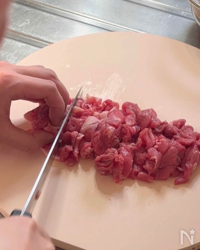 (2) 牛こま切れ肉は細かく切る。