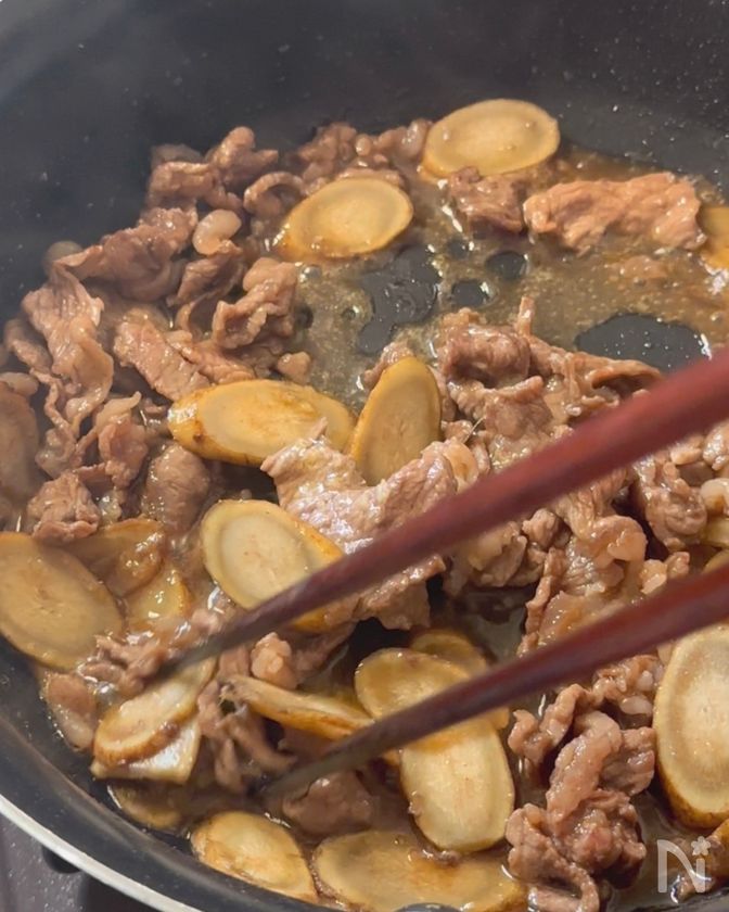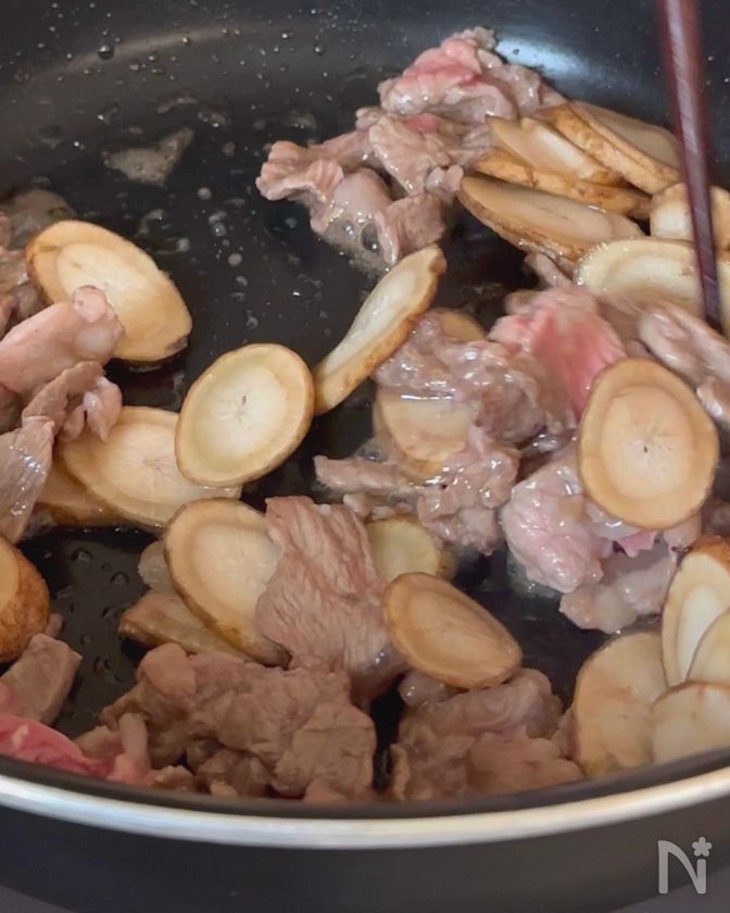 色が変わったらごぼうを加え、しんなりするまで炒める。