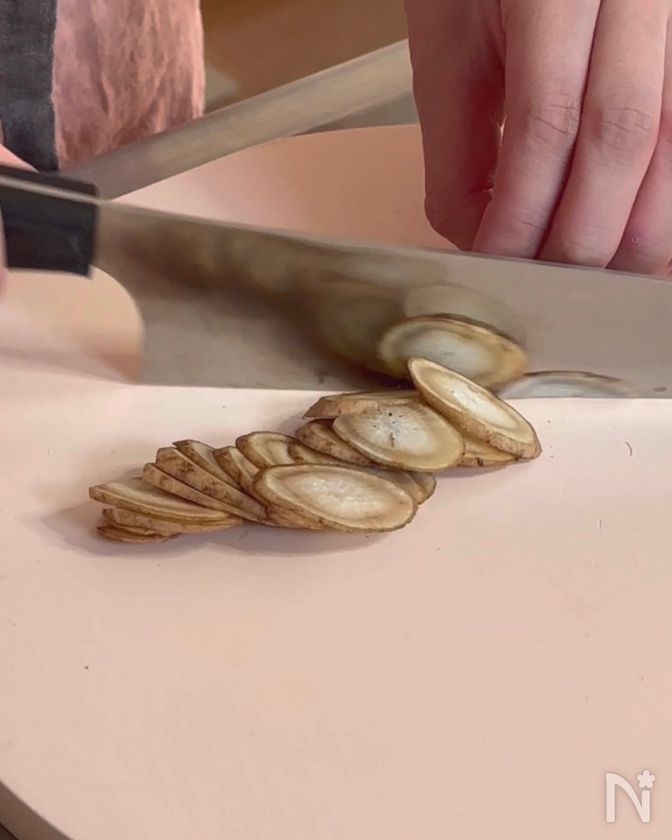 (1) ごぼうは薄切りにして水に5分ほどさらし、水気を切る。