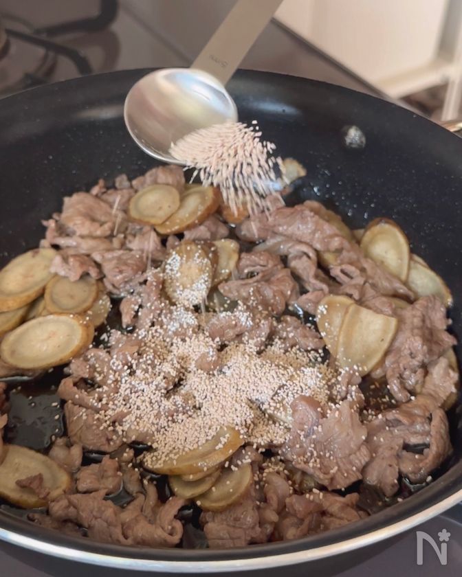 (3) フライパンにごま油を熱し、牛肉を中火で炒める。