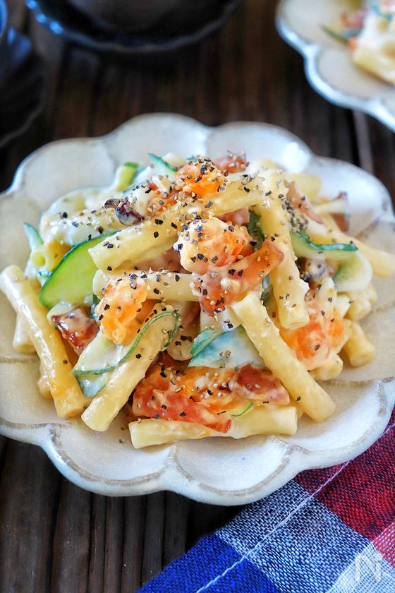 (下準備) マカロニは、袋表示通りに茹でる。茹で上がったらざるにあげて、粗熱を取る。