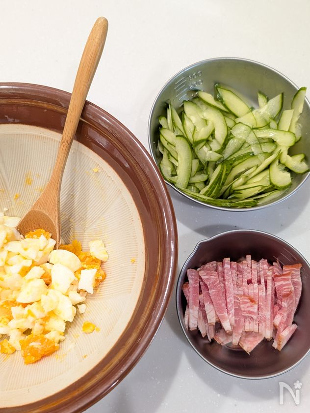 ・ゆで卵は、スプーンやフォークで大きめにつぶす。