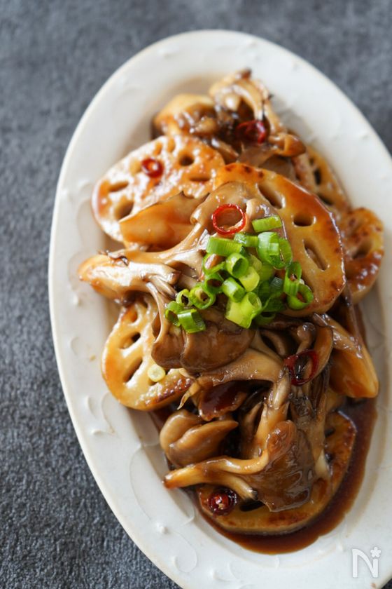 (1) フライパンにサラダ油を入れて火をつけ、蓮根と舞茸を焼く。