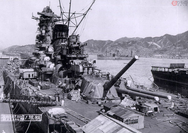 1941(昭和16)年9月20日に撮影された、呉海軍工廠で最終艤装中だった戦艦「大和」の有名な1枚。第三主砲の奥に本記事の主役、給糧艦「間宮」が見える。