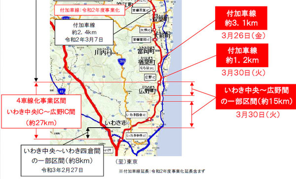 NEXCO東日本は2021年3月5日(金)、常磐道の福島県内で進めている4車線化および付加車線設置事業について、3月下旬に次の区間で運用を開始すると発表しました。