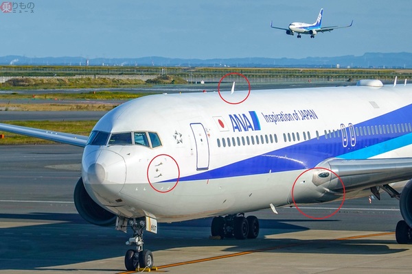 いくつか突起などが見られるANAのボーイング767。記事ではこの赤丸部分の一部に触れていく(乗りものニュース編集部撮影)。