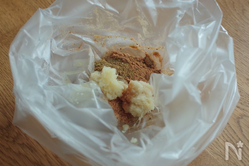 (下準備) 【A】をポリ袋に合わせる。(だしパックは破って中身を全部入れて使います。)