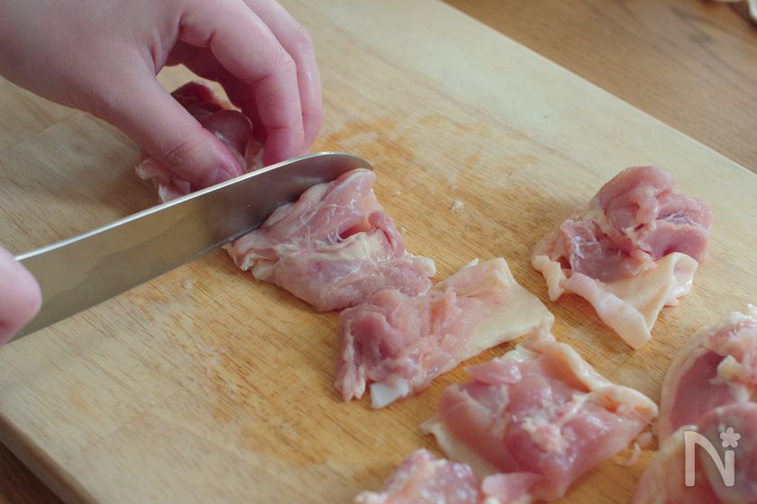 (1) 鶏もも肉を一口大に切り、【A】を合わせたポリ袋に入れてもみ込む。15分以上おく。
