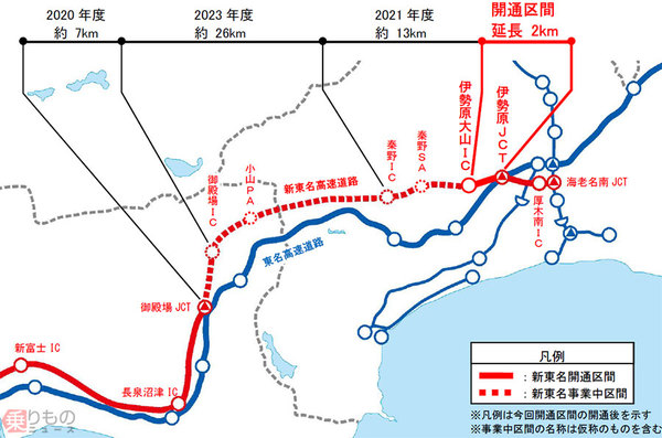 新東名は2019年3月に厚木南IC~伊勢原JCT間が開通し、東名と接続しましたが、そこからさらに1区間、御殿場方面へ延伸します。当初は2019年内の開通予定でしたが、台風19号の影響により建設資材の調達に支障が生じたため、2020年3月の開通になりました。