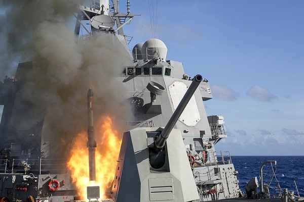 アメリカ海軍のイージス駆逐艦「マスティン」から撃ち出されるアスロック対潜ロケット(画像:アメリカ海軍)。