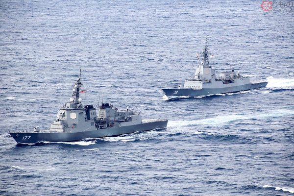 共同訓練「日豪トライデント」に参加した海上自衛隊のミサイル護衛艦「あたご」(左)とオーストラリア海軍のミサイル駆逐艦「ホバート」(画像:海上自衛隊)。