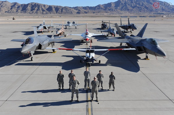 アメリカ空軍や空軍州兵が運用する主要機とともに写真に収まるCAPの隊員たち。中央にあるのがCAPの主力機のひとつであるセスナ172/182(画像:CAP)。