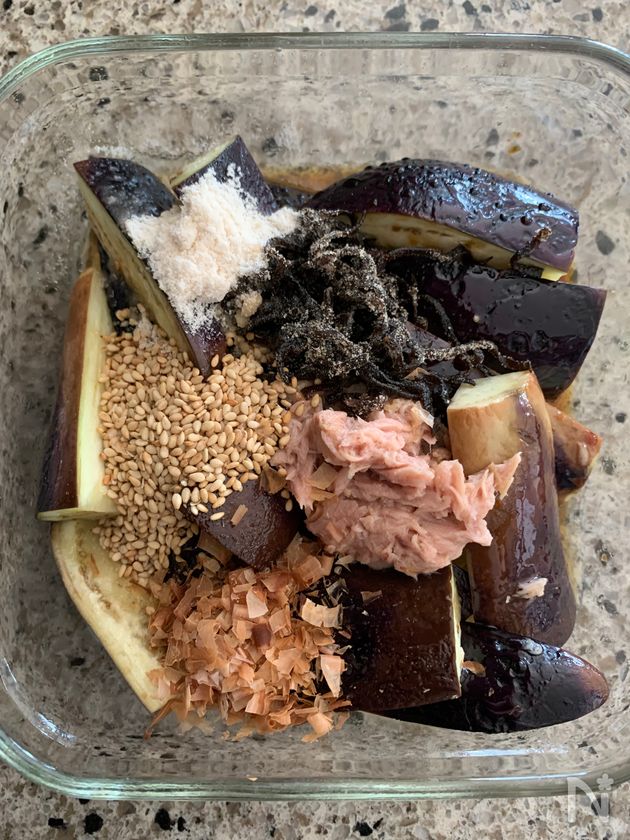 (1) 耐熱容器に茄子とサラダ油を入れて混ぜ合わせる。ふんわりラップをして600w3分加熱する。