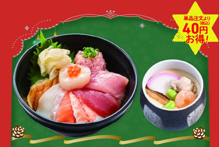 みなみ鮪中とろ・サーモン・まぐろ・いか・いくら・えび・煮穴子・ほたて・ねぎとろの9種の海鮮丼と、だしの風味が広がる茶碗蒸しを一緒に楽しめるセットです。