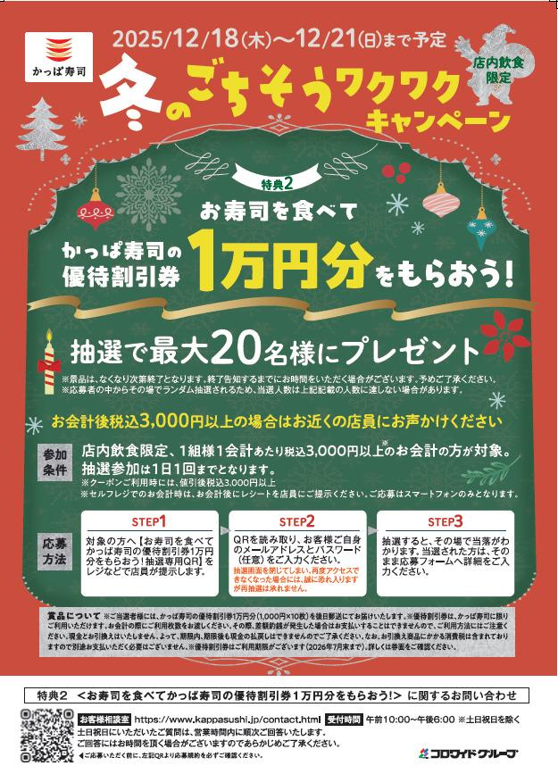 かっぱ寿司は、2025年12月18日から21日まで、「冬のごちそう ワクワクキャンペーン」を開催しています(一部改装中の店舗を除く)。