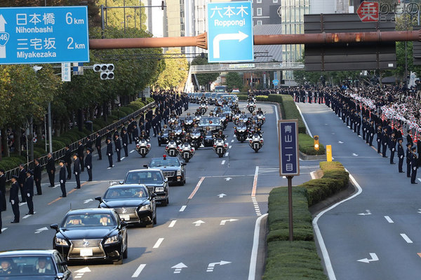 国道246号を進む「祝賀御列の儀」の車列。白バイ隊の前後を挟む形でキャデラック「STS」が確認できる(画像:首相官邸)。