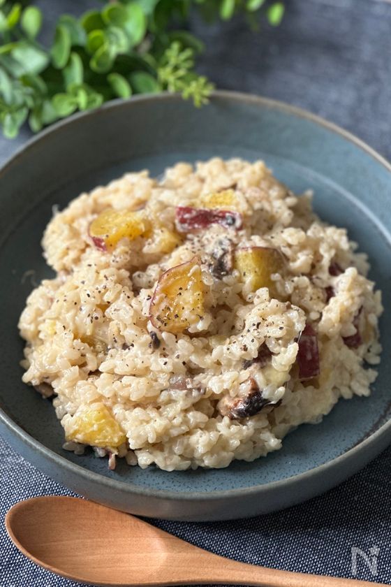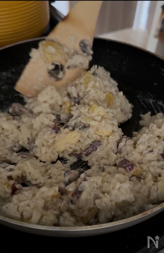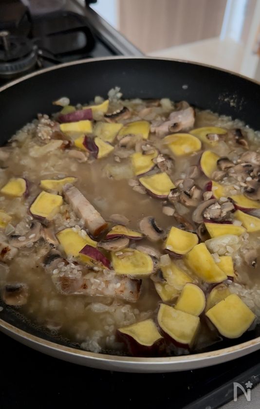 (3) 米が透き通ったら、さつまいも、マッシュルーム、【A】を加えて蓋をし10分ほど弱火で煮る。