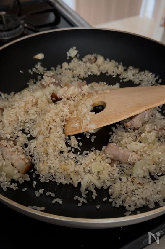 (2) フライパンにオリーブオイルをひき、玉ねぎとベーコンを弱めの中火で炒める。玉ねぎがしんなりしたら米を加えて炒める。