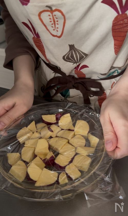 (下準備) さつまいもは1センチ角に切り水にさらす。耐熱容器に並べてふんわりラップをし、レンジ600W2分加熱する。