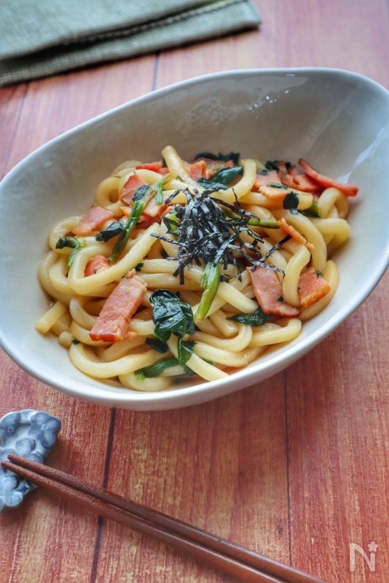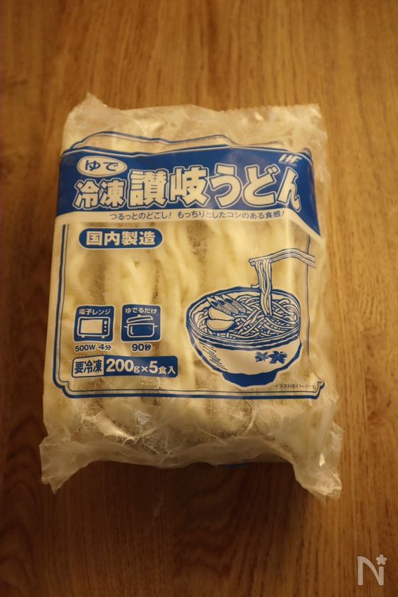 (4) 業務スーパーの冷凍讃岐うどんを使用しました。5食入りで138円という驚きの価格設定で、1玉あたり約27円(価格は店舗や時期によって異なる場合がございます)。まさに“業スー価格バグ”と感じるコスパです。調理方法も簡単で、電子レンジなら500Wで約4分、茹でても約90秒とあっという間。冷凍とは思えないほどモチモチとした食感で、しっかりとした食べ応えがあります。