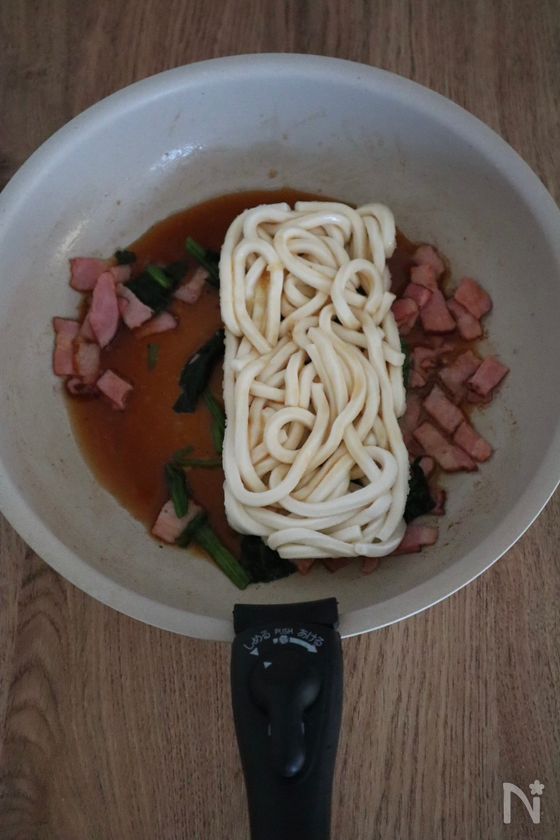 (2) ほうれん草(冷凍)→うどんの順に重ねて入れ、【A】をかけ、沸騰したら蓋をして弱火で5分加熱する。