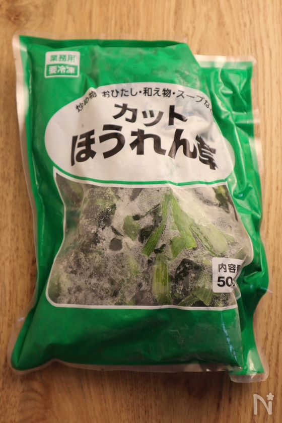 (6) 業務スーパーのカットほうれん草を使用しました。使うときに取り出すだけで、下ゆでやカットが不要。味噌汁、卵料理、炒め物など“あと一品ほしい”という時に大活躍します。袋から出すと固まりになっているため、半解凍して小分けにしておくとさらに扱いやすくなります。