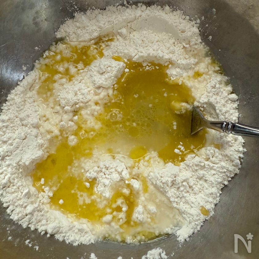 (1) ボウルに強力粉、薄力粉、ベーキングパウダー、塩を入れてフォークなどで混ぜ合わせる。