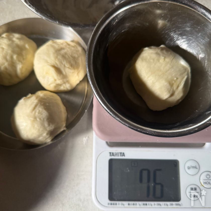 (3) 生地の重さを測り、4等分の重さになるように分け、表面がきれいな球体になるよう丸める。